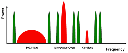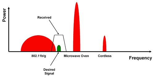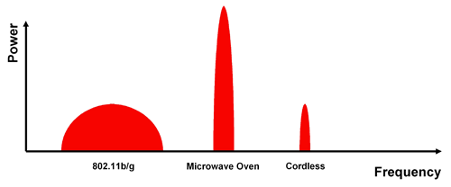 干扰源可大致分为两种类型:驻波设备及跳频设备。驻波干扰源长期处于同一频率之上,有时会有效地阻断这一频率附近的其他通信信号。例如 WiFi、微波炉及直接序列展频 (DSSS) 无绳电话。另一方面,跳频干扰源会不断改变其运行通道。这些干扰源可引起整个频带干扰,而不会长时间地阻断任何单个频率信号。