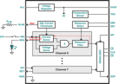 每一条输入通道均包括一个电流检测和电压检测电路,它们将输入信号与其各自的参考阈值进行对比。另外,电流检测功能包括一个具有可调电流极限值范围(0.2mA 到 5mA)的限流器电路。所有通道的电流极限均由外部高精确电阻 RLIM 的电阻值决定。