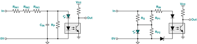 图 2 显示了两种输入通道设计:输入特性由 RIN 和 RP 电阻值决定;通过位于场侧的 LED 指示开关状态;通过 R-C 时间常量来实现噪声抑制;并通过光学耦合器来提供电隔离。