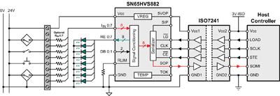开关的“开启-关闭”状态信息由信号调节级完成电平转换和滤波,该调节级的 8 个并行输出均被锁存到串行器中。在外部控制器的管理下,串行器内容以串行的形式被输出。数字隔离器可以提供一个独立的接口,用于场侧 DIS 和控制端基于 PLC 或 PC 系统的系统控制器之间的控制和数据线路。通过将主要器件的串行输出与后面器件的串行输入连接,可以实现多个 DIS 器件的级联,从而获得具有高通道密度的数字输入模块设计。需要注意的是,输入电阻 RIN 0:7 是非 IEC 标准设计的可选组件。零输入电阻允许具有分别为 5V 和 4.5V的“开启”和“关闭”阈值电压的低压开关。