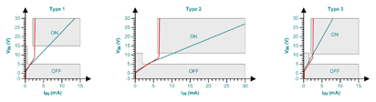 虽然 DI 可符合各种输入特性,但较常用的还是 IEC61131-2 标准的 1 类、2 类、3 类特性(请参见图 1)。