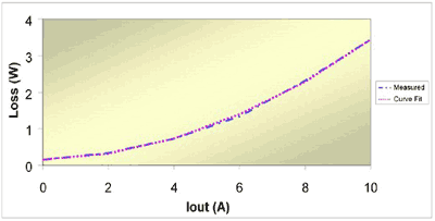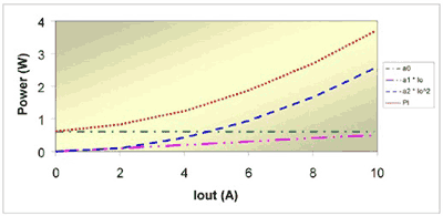 计算三项系数的一种方法是测量三个工作点的损耗并成矩阵求解结果。如果损耗测量结果其中一项是在无负载的工况下得到(即所有损耗均等于第一项系数 a0),那么就能简化该解决方法。随后问题简化至容易求解的两个方程式和两个未知数。一旦计算出系数,即可构建出类似于图 1、显示三种损耗类型的损耗曲线。该曲线在消除测量结果和计算结果之间的偏差时大有用处,并且有助于确定能够提高效率的潜在区域。例如,在满负载工况下,图 1 中的损耗主要为传导损耗。为了提高效率,就需要降低 FET 电阻、电感电阻和互联电阻。