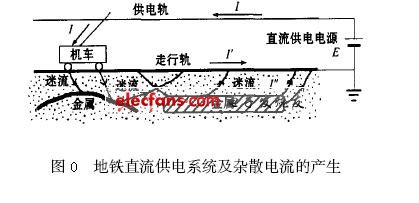 地铁牵引供电一般为直流供电,而当直流大电流沿地面敷设的轨道流动时,直流电流除了在轨道中流动外,还会从轨道泄漏到大地,在大地中的各种金属物体上流动,然后再回到电源系统。这部分泄漏出来的电流称为杂散电流,在地铁工程中又称为迷流,如图0所示。由于杂散电流对埋入地下金属产生腐蚀作用,就可能使得某些地方的地下金属在自然腐蚀的同时又受到严重的杂散电流电腐蚀作用,导致地铁电化腐蚀速度加快。
