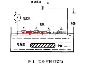 由于地下铁道的特殊环境, 理论上和实际中都难以在现场进行实验, 因此这类课题的研究和实验, 多数情况下往往要在实验室里进行,图1是自行设计的一个实验室模拟地下铁道杂散电流的产生和对地下金属腐蚀作用的实验装置。