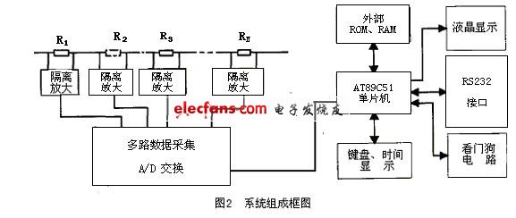 系统的硬件组成框图如图2 所示。各电阻电压信号经过隔离放大,然后通过线性光耦的隔离后,分别传送到多路采集A/D转换芯片0809的输入端进行数据采集。经A/ D转换后的数字量被单片机读入,经处理后可,在液晶上显示出具体数据。同时也可以由通信接口读入微机进行进一步的处理和分析。液晶有系统提示和实时时间显示,可以通过键盘进行选择和控制。