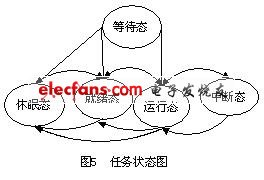 系统中的每个任务包括应用程序、任务堆栈以及任务控制块( TCB) 三部分。任务控制块是一个数据结构,当任务的CPU 使用权被剥夺时,ucosII 用它来保存该任务的状态。当任务重新获得CPU 的使用权时,任务控制块能确保任务从被中断的那一点执行下去。操作系统可以通过查询任务控制块的内容从而对任务进行管理。系统中任务的状态有5 种:休眠态、就绪态、运行态、中断服务和等待态。状态之间的转换如图5所示。