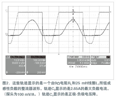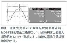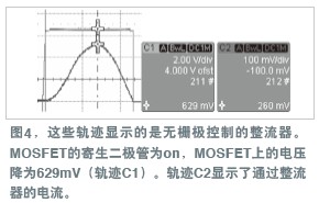 图2给出了负载电压以及整流器Q1 上的压降。图3表示整流器的正常工作情况,其中,较大负载电流2.65A时,压降为33 mV;Q1 工作在欧姆区。反之,如果采用MOSFET,则压降变为629 mV,获得较大连续功率为1.66W(图4)。