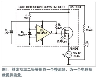 本例给出了一个更经济的方案,它用一个工作在开关模式的MOSFET晶体管,代替了传统的功率二极管。图1显示了采用一只MOSFET晶体管Q1的整流电路,MOSFET管在on状态下有低的漏-源电阻。电路中,V2代表一个36V的交流电源。负载包括9Ω电阻RL和25 mH线圈L1。当电源正极高于漏极电压负极时,比较器IC1产生Q1的栅极电压。因此,源极作为整流器的正极,而漏极则作为负极。电路利用了沿晶体管源-漏方向传导电流的能力。