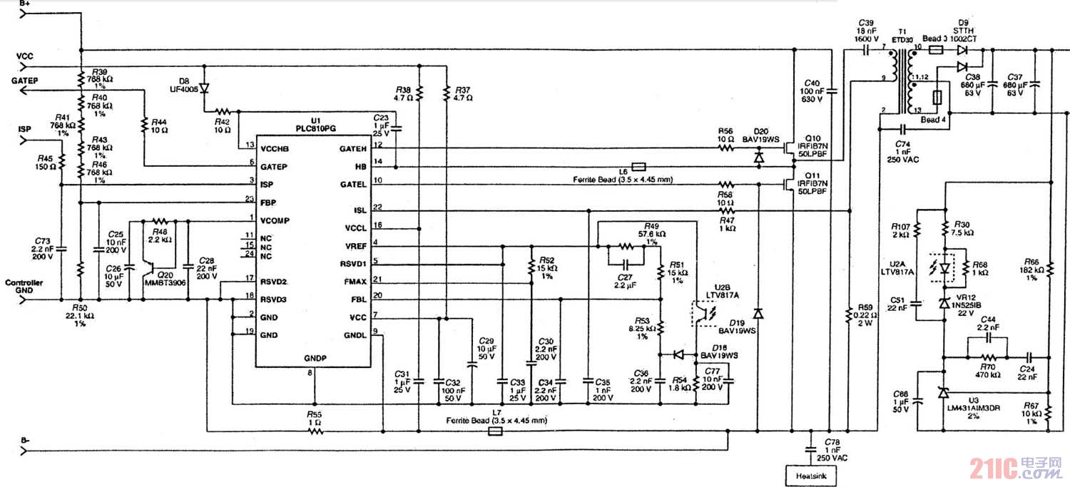 偏置电压VCC经R37 , R38分别加至U1 的VCC和VCCL引脚,将U1模拟电源和数字电源分开。R55和铁氧体磁珠L7,在PFC与LLC地之间提供隔离。U1内半桥高端驱动器由自举二极管D8,电容C23和电阻R42供电。Q10和Q11散热器经C78连接到初级地(B - ) 。