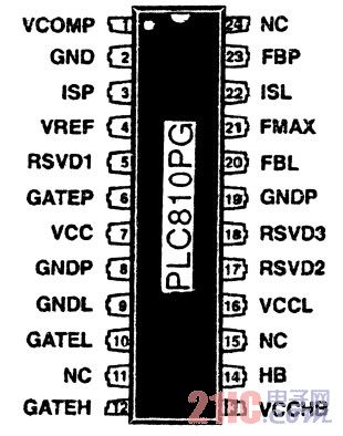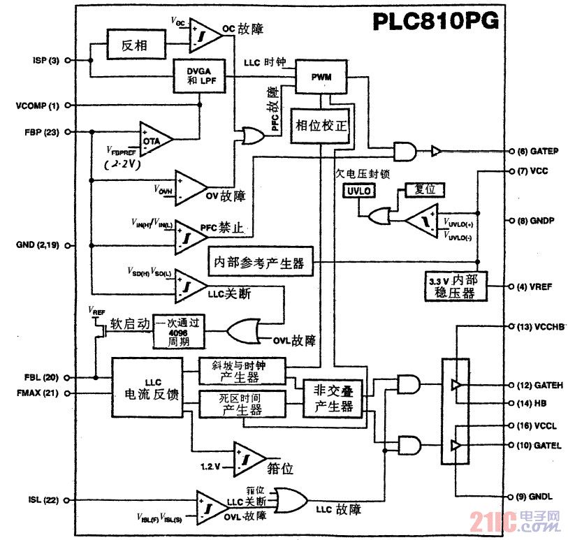 PLC810PG芯片集成了连续电流模式(CCM) PFC控制器和PFC开关(MOSFET)驱动器、半桥LLC谐振控制器及半桥高、低端MOSFET驱动器,如图4所示。