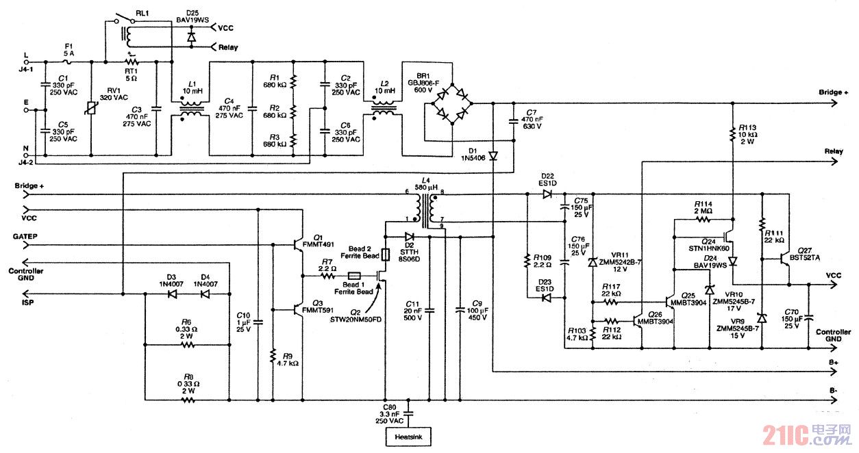 L4, PFC开关(MOSFET)Q2,升压二极管D2和输出电容C9等,组成PFC升压变换器主电路。在140~265VAC输入电压范围内,输出电压稳定在385VDC (B+与B - 之间) ,并在BR1输入端产生正弦AC电流,使系统呈现纯电阻性负载,线路功率因数( PF)几乎等于1。晶体管Q1,Q3等组成Q2的缓冲级。R6和R8是PFC级电流传感电阻,二极管D3, D4在浪涌期间箝位R6和R8上的电压(即两个二极管上的正向压降) 。Q2栅极和漏极串接的铁氧体磁珠( Φ<3. 5 mm ×3. 25 mm, 20 Ω ) ,用作改善EM I特性。PFC开关Q2的散热器通过C80接初级地(B - ) 。