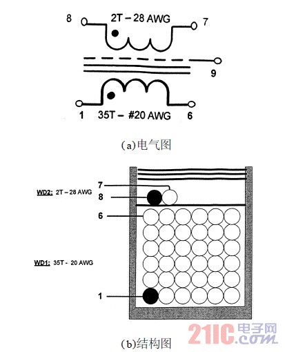 PFC升压电感器L4使用PQ32 /20磁心和12引脚骨架,电气图和结构图如图6所示。