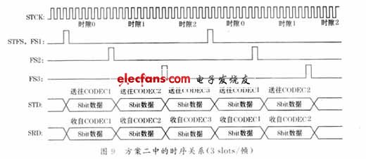 这种方案是通过选择双声道的CODEC来实现的,连接示意框图参见图10。这时,CODEC中的SSI端口就工作在网络模式,每帧为两个时隙,它在第一个时隙中传输左路采样信号,而在第二个时隙中传输右路采样信号。我们将DSP中的SSI端口作相应的配置即可实现我们所需要的功能,具体情形就不赘述了。这里需要说明的一点是,位时钟和帧同步信号也有可能是由CODEC一方来驱动的。