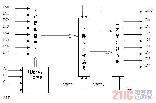 地址输入和控制线:4条 。ALE为地址锁存允许输入线,高电平有效。当ALE线为高电平时,地址锁存与译码器将A,B,C三条地址线的地址信号进行锁存,经译码后被选中的通道的模拟量进转换器进行转换。A,B和C为地址输入线,用于选通IN0-IN7上的一路模拟量输入。