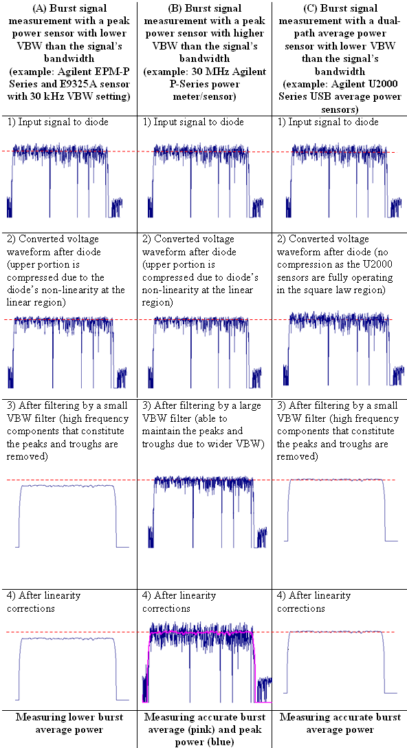 图 2:在以下条件下测量宽带信号猝发脉冲平均功率的准确度:(A) 功率计和传感器的视频带宽小于信号带宽;(B) 功率计和传感器的视频带宽大于信号带宽;(C) 平均功率传感器使用双通道二极管,完全工作在平方律区域