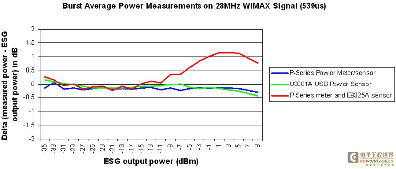 P系列 N1911A/12A 功率计和N1921A/22A传感器凭借其平坦和宽广的30MHz视频带宽,可提供较精确的测量。E9325A 具有300kHz的视频带宽,可提供高达 -10dBm的良好精度,它的二极管平方律区域可达到-10dBm。在-10dBm以上时,由于它的视频带宽有限,以及二极管在高功率电平时的非线性,测量结果开始出现偏差。U2000系列尽管视频带宽有限,但由于具有双通道二极管结构和完全工作在平方律区域的特性,所以还是能够对宽带宽 WiMAX信号执行精确的测量。U2000传感器还具有一些其他优点,例如更快的测量速度和更经济的价格。表1对P系列功 率计和U2000系列USB功率传感器执行猝发脉冲功率测量的结果进行了比较。