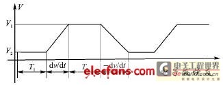 通过对电源的编程,可以方便地实现图1所示的电压输出波形。其中,V1、V2、T1、T2、dv、dt都是可以通过编程来设定的。电压值的输出范围为0~16V,较大输出电流为10 A。输出电压精度为0.1 V,电流精度为10mA。电流的设定值指的是允许输出的较大电流,也可以被编程为与输出电压一样的波形。