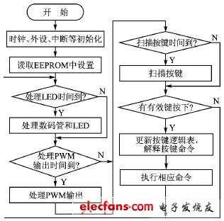 软件用C语言编写,使用HighTech公司为PIC系列单片机提供的PICC编译器。系统上电时,单片机读出非易失性存储器(EEPROM)中上次设置参数,进行电流电压输出。在软件设计中,采用多个任务的概念,可以模拟一个简单的操作系统进行任务的调度。由定时器产生一个5ms的中断,在中断程序中激活各个任务的标志。如显示任务主要负责A/D采样、数码管与LED的刷新,可每5ms执行一次。键盘处理任务负责按键的扫描、软件去抖、键盘命令的解释和扫行,可每10ms执行一次。PWM输出任务负责按照设定的值进行PWM的输出,可以每50ms执行一次。如果有PC机或其他电源通过串口编程,单片机将在UART中断中接收编程数据,接收完改写EEPROM中设置并强行复位。如果接收到通过按键的编程,则在按键处理中修改EEPROM的设置并复位。程序主流程则扫描各个任务是否到时间执行。是,则执行该任务;否则,跳过该任务。主程序流程如图7所示。