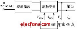 图3中,电网电压经整流滤波后供给高频变换电路,由高频变换电路产生输出。单片机输出两路PWM信号,给电源模块提供输出电压的参考值和电流的限流值,电源模块按照单片机提供的参考值输出电压和限定较大电流。虽然单片机采样输出电压和电流进行显示,但这里单片机并不参与系统的反馈,反馈通过电源模块来实现(在后面的部分中会详细讲到)。
