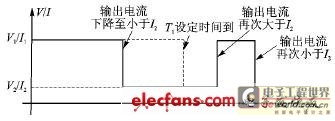 另外,电源也可以工作在铅酸电池充电器的模式(简称“LBC模式”)。根据铅酸电池的特性,当电源工作在LBC模式时,电源首先将输出较大的充电电压和电流V1/I1,至少维持10s;当充电电流降到小于设定值I2时,电源输出较小的充电电压和电流V2/I2。如果到了设定时间T1,充电电流还未降到I2以下,这时电源输出也会降为V2/I2。当输出电流再次大于I2时,电源将再次输出V1/I1充电。其中,V2设定值必须小于14V。若设置为大于14 V,电源会自动将其设成14 V。I2的值必须大于1/8I1,否则将被自动设成1/8I1。LBC模式如图2所示。
