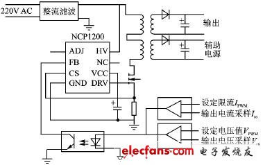 图4是以NCP1200为控制芯片的电源电路的结构。从图中可以看到,电源模块中有两种反馈类型。第一种是输出电压反馈,输出电压采样值VSS和单片机提供的设定值进行比较,通过光耦来控制NCP1200芯片FB脚的电压,调整DRV脚输出PWM的脉宽来控制场效应管的导通和关断时间,从而达到调整输出电压值的目的。另一路反馈是电流限流反馈,当采样到的输出电流值ISS超过单片机提供的较大限流值IPWM后,比较器输出正电压使得光耦较大导通,将FB脚电压拉低,使得NCP1200输出PWM脉宽减小,从而达到限流的目的。当输出电流小于单片机提供的限流值时,限流反馈不起作用。
