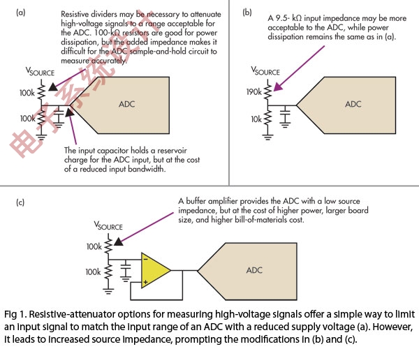 图1:用于测量高电压信号的电阻衰减器可以提供一种限制输入信号的简单方法,以使ADC的输入范围与较低的电源电压相匹配(a)。但是这会导致源阻抗增加,从而需要进行(b)和(c)中的修改。
