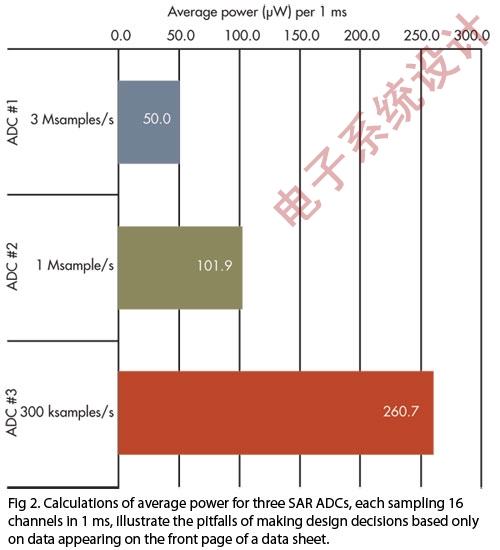 只看数据手册首页时,功耗较差的似乎是3Msample/s ADC。但是进一步研究其有功功率、关断(或待机)功率和有效的采样率之后,很明显,选择采样率较高的ADC实际上更为合适。
