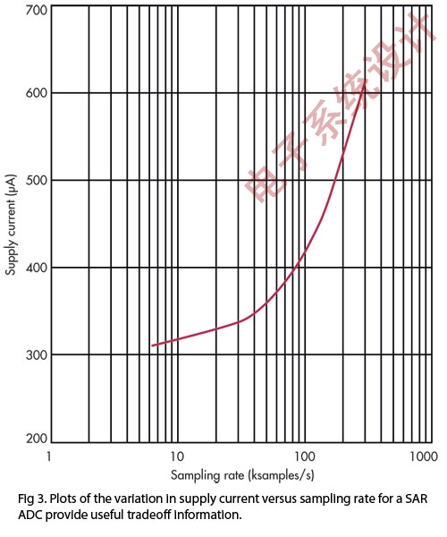 让我们研究一下图2中300ksample/s ADC采用3V电源供电(图3)时的电源电流与采样率关系图。采样率为300ksamples/s时的功耗为3V×0.62mA = 1.86mW,但采样率为100ksamples/s时仅为1.26mW,可以节省32%的功率。