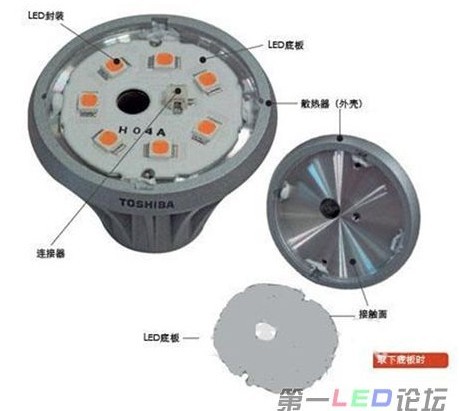 球泡灯的LED通常焊接在一块铝基板(LED底板)上,这块铝基板再和一片圆形铝散热板固定,然后再把这块铝散热板固定到散热器外壳上去(见图7)。