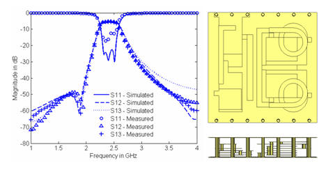 采用CST MWS时域求解器快速仿真LTCC多层结构的各种器件。由于采用了PBA和TST网格技术,仿真可以精确计及任意有限厚度有限电导率的金属走线。下图示出带有不平衡输入到平衡输出巴伦的蓝牙带通滤波器的结构和仿真结果。可以看到,仿真与测试结果吻合相当好。