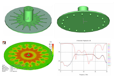 这是一个1进16出的等功率功分器,工作频率为7-14GHz。采用CST MWS时域求解器一次仿真便得出整个0-20GHz带宽中的驻波和传输特性。由于采用了PBA和TST网格,故可以采用比微带线厚度和缝隙大得多的网格进行高精度仿真。从S参量频率特性曲线可以看出,仿真结果是令人满意的。