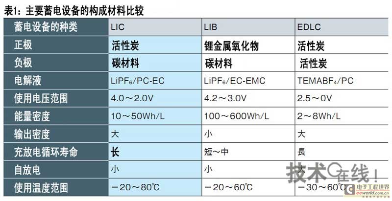 通过添加锂离子,LIC不但电压升高至约4V,还提高了负极存储的静电容量,单元整体的静电容量可增至原双电层电容器(EDLC)的2倍左右。因此,LIC与EDLC相比具有高电压大容量的优点(表1)。