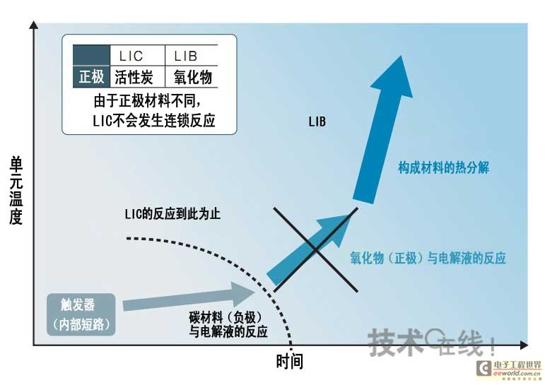 而LIC的正极采用活性炭,虽然发生内部短路时会与负极发生反应,但那之后正极与电解液不会发生反应,从原理上可以说是安全的(图1)。