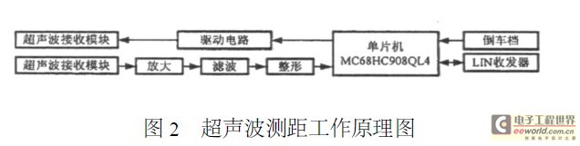 测距电路主要由超声波发射电路和接收电路组成,原理框图如图2所示。该模块单片机选用Freescale公司的MC68HC908QL4,该芯片可靠性高、抗干扰能力强,内含4kB闪速存储器,四通道10位A/D转换器,并集成了LIN控制器。超声波探测车物之间的距离,并将数据经LIN总线传送至车内主处理器。由于超声波测距只在汽车倒车时为驾驶员提供车后信息,而倒车时车速较慢,与声速相比可认为是静止的,因此采用脉冲测距法,只测量超声波在测量点与目标间的往返时间计算距离较简单。