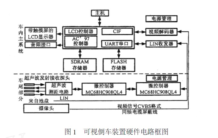 本文提出的可视倒车装置硬件电路框图如图1所示,主要由Intel嵌入式处理器PXA270、视频采集、超声波测距等电路组成。两对超声波换能器、信号调理电路和微控制器完成对障碍物的距离测定,并通过LIN总线发送至车内主系统;摄像头采集到的视频复合信号通过同轴电缆送至视频解码芯片进行A/D转换,并产生YUV422格式的视频信号输入PXA270的快速捕捉摄像头接口;主系统处理器利用字符叠加技术,在TFTLCD屏上将含有障碍物距离等参数的图像信号播放出来。