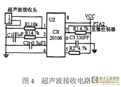 (2)超声波接收电路超声波接收电路如图4所示。采用专用前置放大器CX20106,由前置放大器、限幅放大器、带通滤波器、检波器、积分器、整型电路组成。其中,前置放大器具有自动增益控制功能。超声波信号在空气中传播遇到障碍物后发生反射,回波经接收探头接收并转换成电信号,经条理电缆,输入到微控制器的外部中断口,使计数器停止计数,从而计算出障碍物的距离。