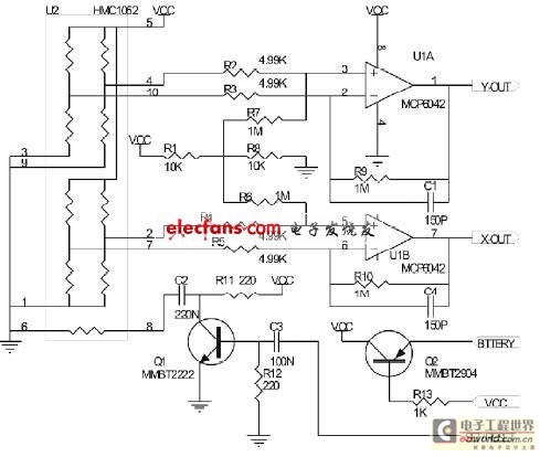 图2中Q1、C2、C3、R11、R12构成简单的置位电路,可以为HMC1052提供大电流脉冲。用单片机完成电路的控制。当SET/RESET输出低电平时,Q1截止,C2充电到VCC,C3放电到0V。当SET/RESET输出由低到的高电平时,R12和C3使Q1导通,由C2、Q1和HMC1052的S/R+(6引脚)S/R-(8引脚)间电阻构成回路,形成大约0.5A的置位脉冲,脉冲宽度约2μs。SET/RESET输出由高到低的时候,由R11限流形成复位脉冲。为节省电池能量,置位/复位电路每十分钟工作一次。电路以一种倒转的方式改变传感器输出极性,即驱动置位脉冲读数一次,在驱动复位脉冲读数一次,两次读数相减可以消除因温度漂移和电路参数等共模信号造成的影响,从而得出一个与绝对磁场成正比例的输出。