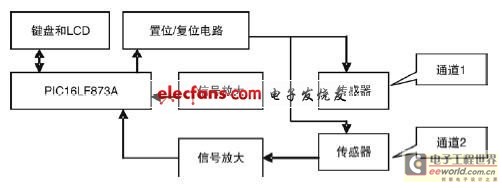 便携式磁记忆检测仪以单片机PIC16LF873A为核心,用HMC1052两轴磁阻传感器检测法向分量Hp(y)的X分量和Y分量,经过信号放大后,送单片机PIC16LF873A的A/D转换通道,获得的数据经计算得到Hp(y)值,送LCD显示。为检测方便,设置了两个检测通道,作为应力集中线Hp(y)符号比较的依据。