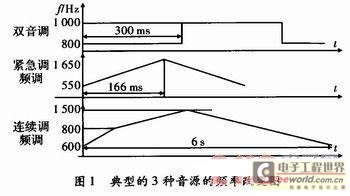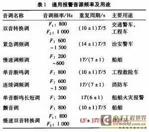 表1中列出了国际上通用的几种报警音源的频率和用途。