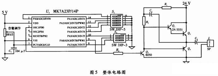 图5为整体电路图,大部分功能由单片机处理,而MK7A23P内有上拉电阻、复位电路、振荡器、WDT等,因此电路简单,S1和S2为模式和音源选择开关。功率放大器工作在开关状态,输出信号经过Q3电平转换后通过射极跟随器输出,C1、R1、R2组成自举电路,提高输出的高电平电压,从而进一步提高效率。