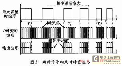 缺点为:一是相乘信号的频率较高,因此开关管工作在高速状态,效率降低;二是要求音源波形的上升沿与相乘的信号波形的上升沿必须同步,否则产生噪音(图3中的同步点);三是以连续调频改变量较慢时,随周期变短则减少一个高频脉冲,音量减少,在小音量时可出现严重的周期性的“嘟、嘟”声音。