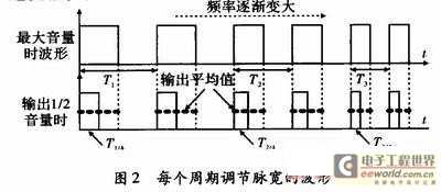 通常使用的脉宽方式调节音量的方法有两种:一是在音源信号的每个周期内按照衰减要求比例衰减高电平时间,实现脉宽调节。由于频率不变,因此基频不变,但平均电压降低从而可调节音量,如图2所示。这种方法如果使用硬件电路实现,则电路比较复杂,利用单片机实现,则进行乘除法计算,要求运行速度很快。