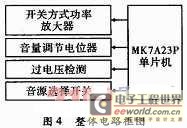 整体电路框图如图4所示,由简单的驱动器组成的功率放大器、音量调节用电位器、过压检测器、音源选择开关、单片机等部分组成,具有完善的保护功能和很高的效率。