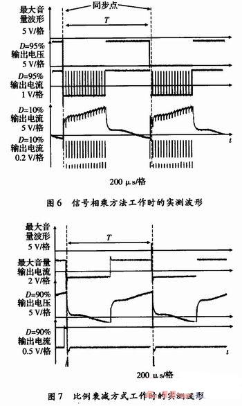 图6为采用第一种方案的实测波形,即信号相乘方法。每个音源波形的高电平上升沿处有高电平脉冲,有效地避免频率的微变而产生的噪音。较大音量输出时扬声器中电流是连续的,而较小输出时扬声器中电流也是连续的,且对扬声器的冲击很小。如果加滤波器可进一步虑除高频脉冲,减少对扬声器的冲击。因此除了连续调频调以外的音源采用这种方法,即可有效地避免音色的改变。