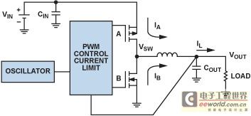 在图 3 中,开关 A 和开关 B 分别利用 PFET 和 NFET 开关实现,构成一个同步降压调节器。“同步”一词表示将一个 FET 用作低端开关。用肖特基二极管代替低端开关的降压调节器称为“异步”(或非同步)型。处理低功率时,同步降压调节器更有效,因为 FET 的压降低于肖特基二极管。然而,当电感电流达到 0 时,如果底部 FET 未释放,同步转换器的轻载效率会降低,而且额外的控制电路会提高 IC 的复杂性和成本。