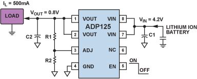 电池的续航时间是新型便携式设备设计高度关注的一个特性。提高系统效率可以延长电池工作时间,降低更换或充电的频度。例如,一个锂离子充电电池可以使用ADP125 LDO以 0.8 V电压驱动一个 500 mA负载,如图 6 所示。该LDO的效率只有 19% (VOUT/VIN × 100% = 0.8/4.2 × 100%)。LDO无法存储未使用的能量,因此剩余的 81%的功率(1.7 W)只能以热量形式在LDO内部耗散掉,这可能会导致手持式设备的温度迅速上升。如果使用ADP2138 开关调节器,在 4.2 V输入和 0.8 V输出下,工作效率将是 82%,比前一方案的效率高出 4 倍多,便携式设备的温度升幅将大大减小。这些系统效率的大幅改善使得开关调节器大量运用于便携式设备。