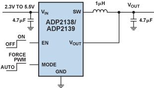 ADP2138 是一款紧凑型 800 mA、3 MHz、降压 DC-DC 转换器。图 4所示为典型应用电路。图 5显示了强制 PWM工作模式下和自动 PWM/PSM 工作模式下的效率改善情况。由于频率存在变化,PSM 干扰可能难以滤除,因此许多降压调节器提供一个 MODE 引脚(如图 4 所示),用户可以通过该引脚强制器件以连续 PWM 模式工作,或者允许器件以自动 PWM/PSM 模式工作。MODE 引脚既可以通过硬连线来设置任一工作模式,也可以根据需要而动态切换,以达到省电目的。