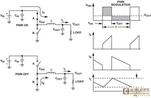 目前的低功耗同步降压调节器以脉宽调制(PWM)为主要工作模式。PWM保持频率不变,通过改变脉冲宽度(tON)来调整输出电压。输送的平均功率与占空比D成正比,因此这是一种向负载提高功率的有效方式。
