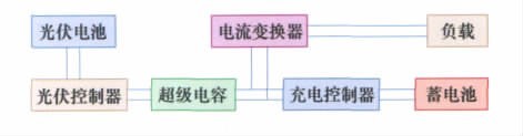 控制系统在光伏控制器和充电控制器基础上增加了超级电容,跨接在直流母线和地线之间,以便稳定直流母线的电压,并缓冲光电池提供的过大能量,然后放电给蓄电池,再提供给负载。
