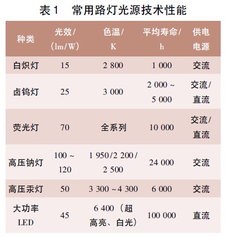 传统的照明灯具效率低,如白炽灯、卤钨灯等,不适合智能建筑节能理念,各种照明光源的性能比较如表1 所示。白光超高亮度的LED 灯具,光效为45 lm/W,虽然不高,但是发出的光线都在可见光范围内,适合用于照明光源。LED 灯具寿命长,可达100 000 h 以上,可以有效减少灯具垃圾。另外,LED 由低压直流电源供电,更加安全,而且适合频繁开、关。因此太阳能照明系统选择了12 V、10 W 的白光超亮大功率LED 灯具,其光效可以达450 lm/W,相当于50 W 的白炽灯,可以达到良好的照明效果。